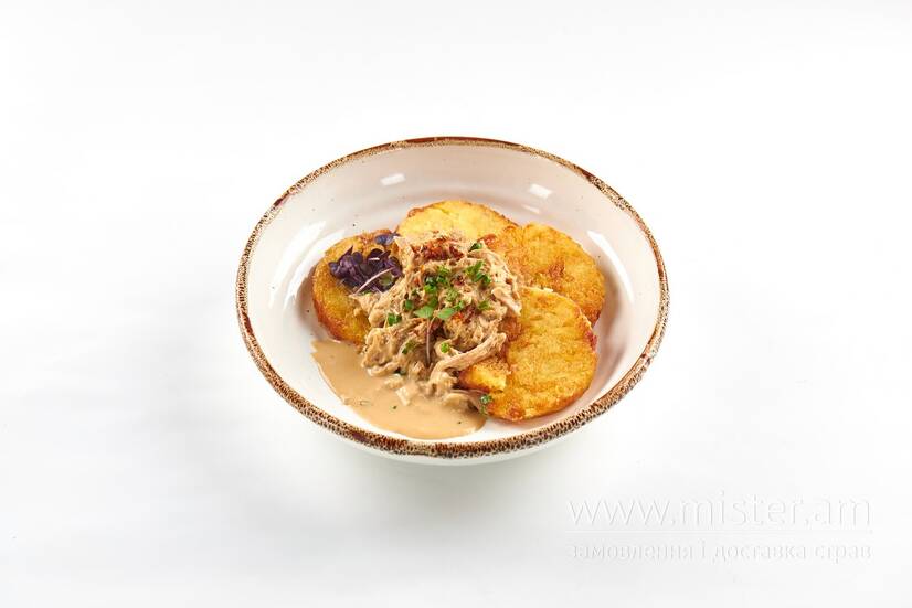 Деруни з рваною свининою та вершково-бульйонним соусом. Насичений смак і ситна текстура.