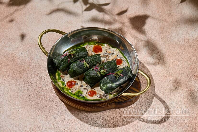Ніжні голубці в листях шпинату з рваною свининою, булгуром і пікантним соусом. Подаються з грибним соусом, смак повний і збалансований.