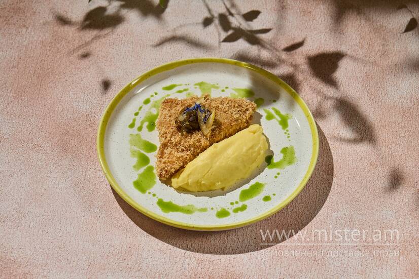 Ніжна котлета з філе морського окуня з картопляним пюре, декорована маринованим огірком, портулаком та волошками. Делікатний смак риби в класичному стилі.
