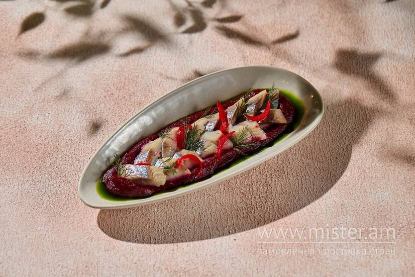 Делікатний оселедець на кремі з буряка з легкою кислинкою. Свіжий смак і насичена текстура роблять закуску ідеальною для апетитного старту.