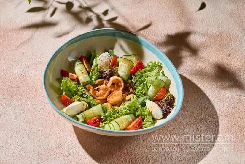 Свіжий мікс салатів з огірками і черрі, морепродукти з ніжним соусом. Легкий, водночас насичений смак моря, що пробуджує апетит.