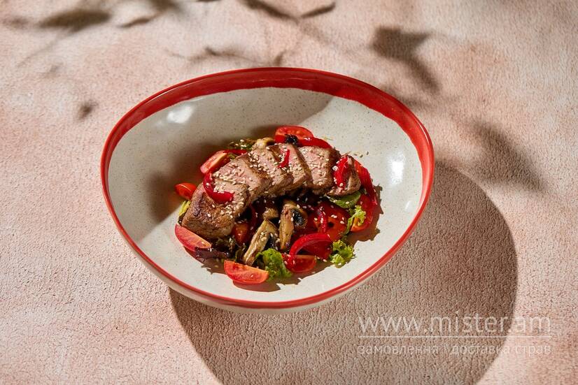 Підсмажений стейк із печерицями, черрі і міксом салатів, заправлений пікантним соусом. Насичений смак м`яса та овочів пробуджує апетит і залишає відчуття задоволення.