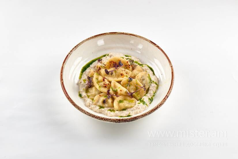Вареники з м`якою картопляною начинкою та грибами, подаються з грибною сметаною. Класичне поєднання для любителів традиційної української кухні.