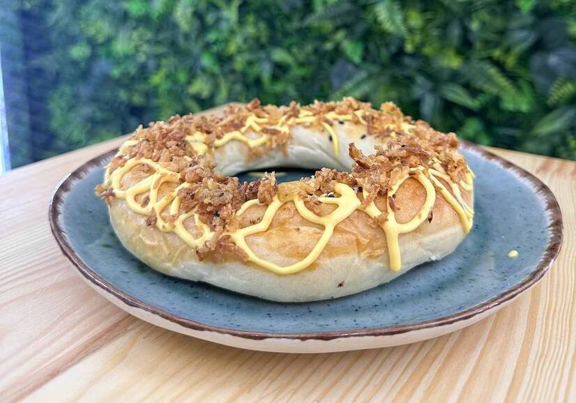 Тісто дріжджове, філе курки, сирний соус, смажена цибуля.