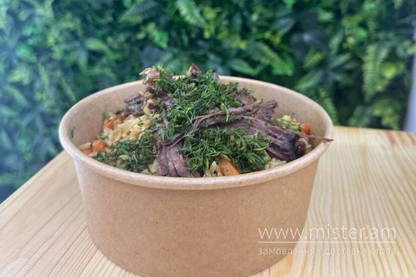 М`ясо телятини, спеції, плов, яйце перепелине.