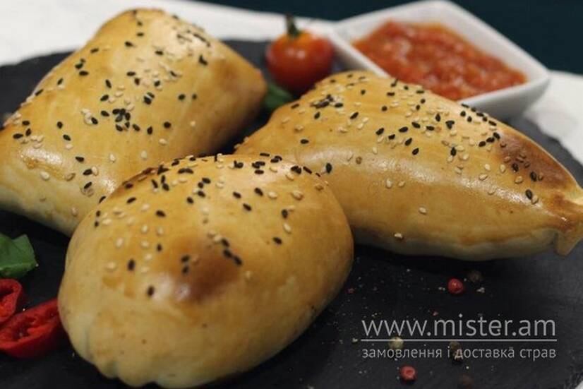 Випікається в тандирі. Тісто дріжджове, м`ясо рублене курка, спеції, цибуля.