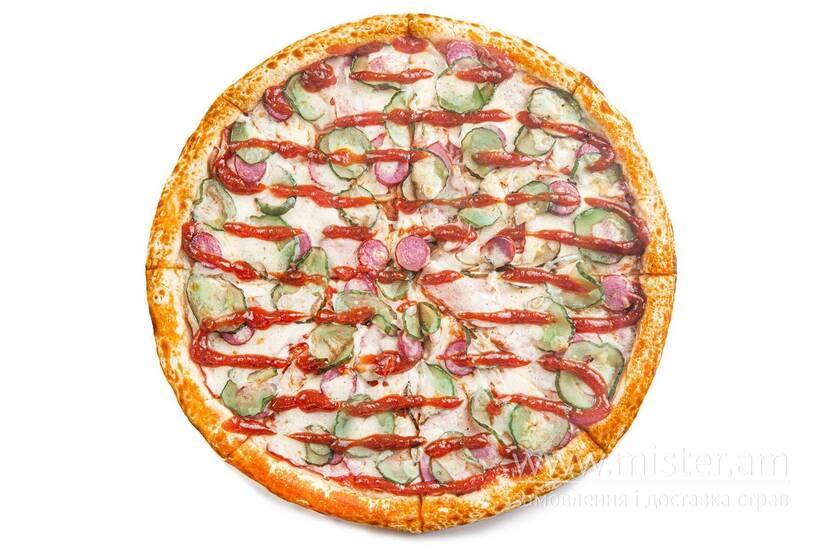 Мисливські ковбаски, балик, моцарела, огірки мариновані, цибуля, соус пелаті-базилік та соус сацебелі.