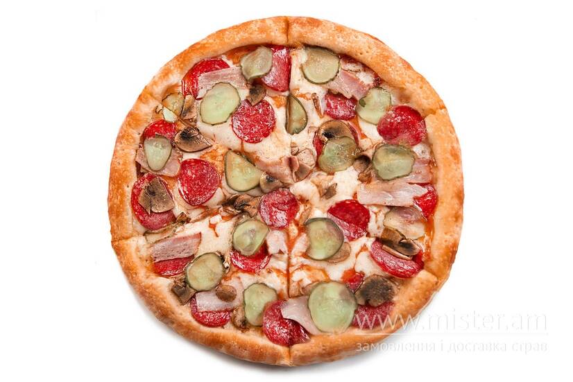Папероні, бекон, збільшена моцарела, печериці, мариновані огірочки та соус пелаті-базилік.