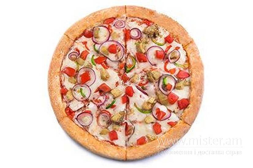 Ароматне курча, томати, чилі та маринований перець, моцарелла, цибуля, соус пелаті-базилік.