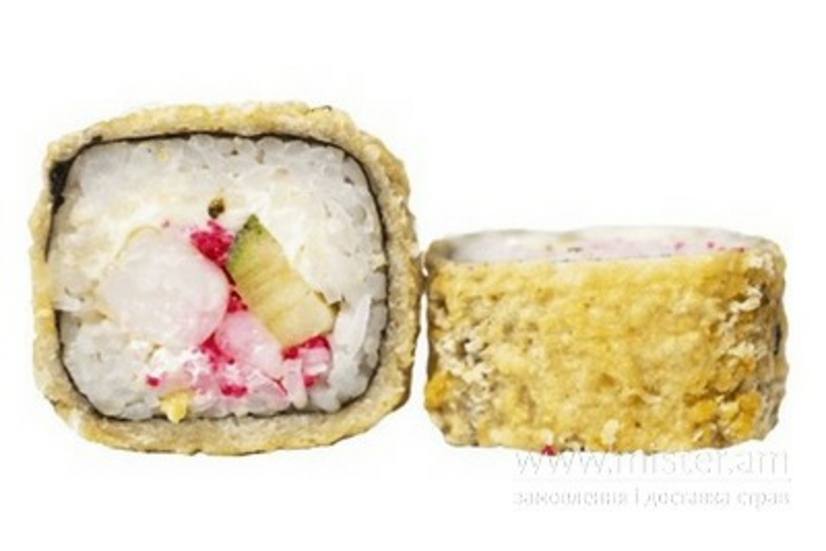 Васабі, ікра масаго, імбир, креветка тигрова, крем-сир, кляр, норі, огірок, панірувальні сухарі, рис, соєвий соус.