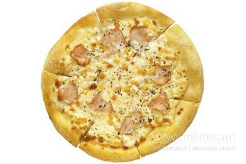 Sous тісто, італійські трави, кукурудза, вершкова моцарелла, соус Ranch, копчена курка.