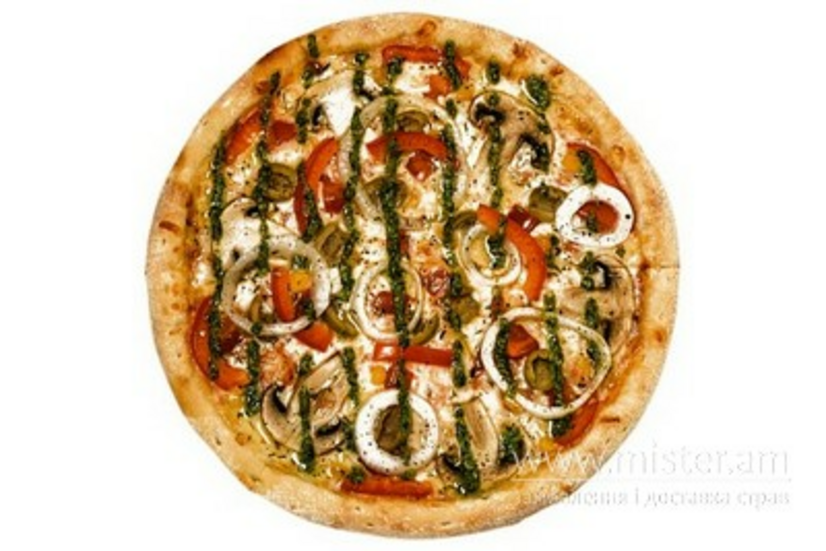 Sous тісто, вершкова моцарелла, італійські трави, кукурудза, оливки, перець паприка, печериці, соус Tomato, томат, цибуля маринована.