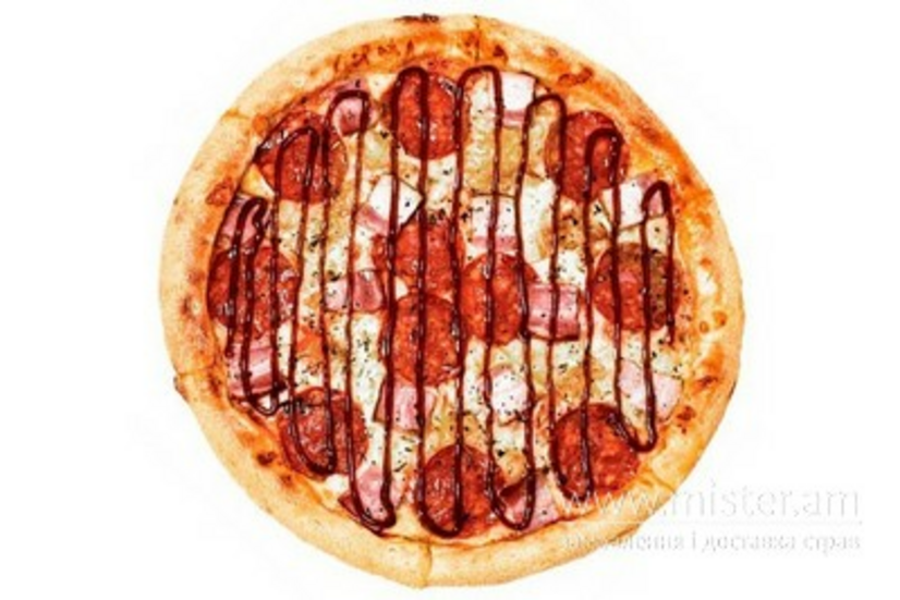 Sous тісто, бекон, італійські трави, гостра пепероні, вершкова моцарелла, соус BBQ, соус Tomato.