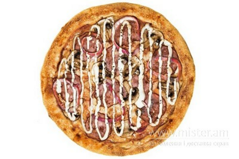 Sous тісто, вершкова моцарелла, італійські трави, печериці, соус Ranch, соус Tomato, цибуля маринована, шинка.