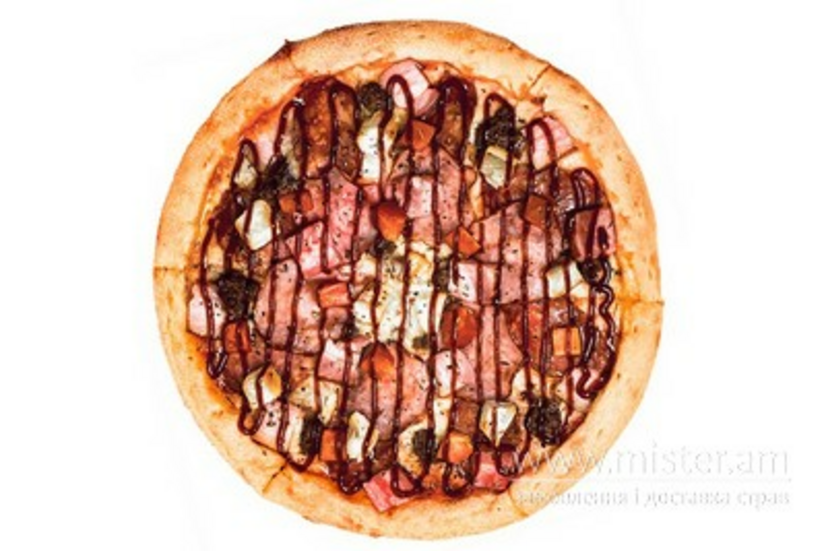 Sous тісто, вершкова моцарелла, гостра пепероні, італійські трави, карбонат, соус BBQ, томат, фарш яловичий, філе-гриль, часниковий соус, шинка.