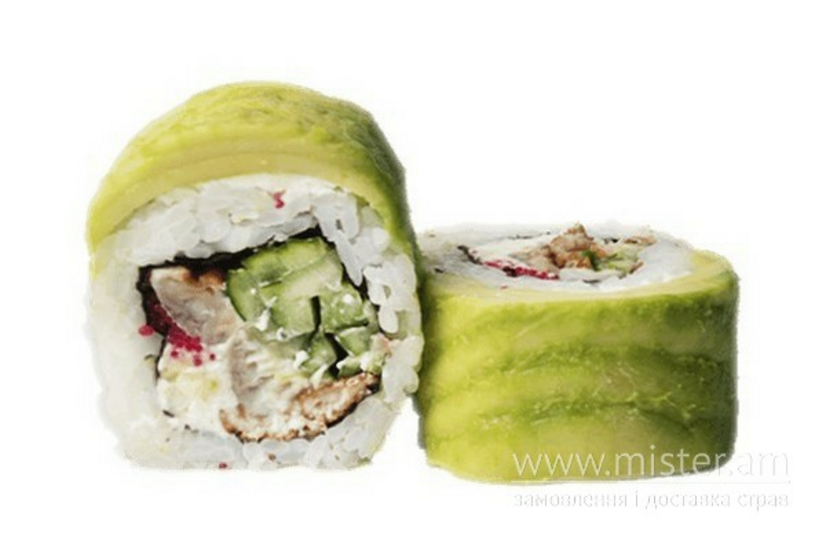 Авокадо, васабі, вугор, імбир, ікра масаго, крем-сир, кунжут, огірок, норі, рис, соус унагі, соєвий соус.