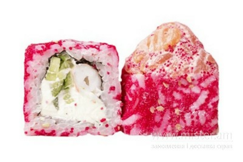 Васабі, ікра масаго, імбир, креветка тигрова, крем-сир, кунжут, лосось, майонез, норі, огірок, рис, соєвий соус.