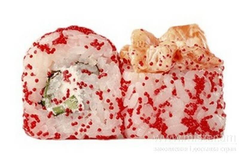 Васабі, ікра масаго, імбир, креветка тигрова, крем-сир, кунжут, лосось, майонез, норі, огірок, рис, соєвий соус.