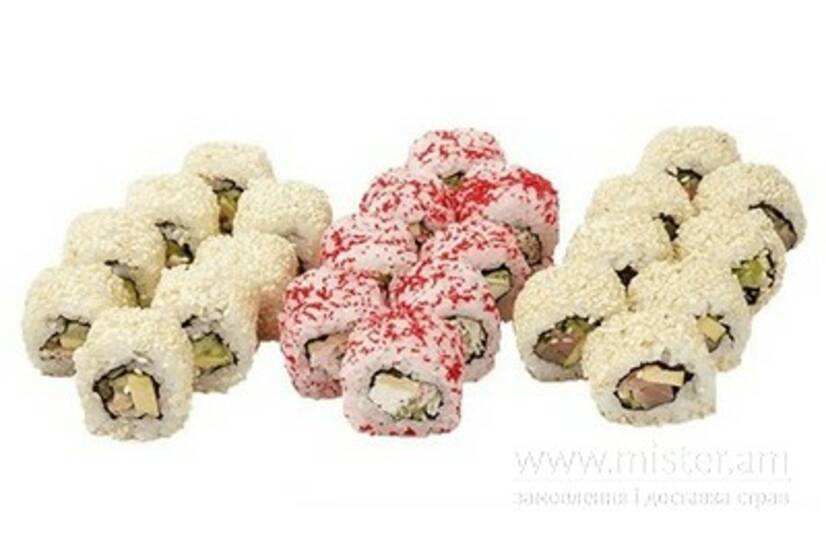 California з вугрем та авокадо, California з креветкою та авокадо, California з лососем та авокадо, васабі, імбир, соєвий соус.
