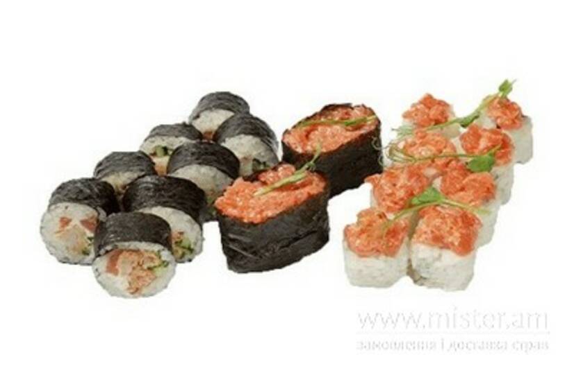 Spice з лососем та манго, Futomaki з лососем та креветкою панко, Gunkan зі spice лососем 2 шт., васабі, імбир, соєвий соус.