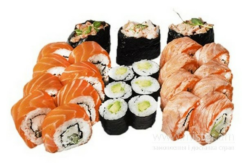 Lux Philadelphia з лососем, Lux Philadelphia Татакі з лососем та авокадо, Makі з авокадо, Gunkan зі spice лососем 2 шт., імбир, васабі, соєвий соус.