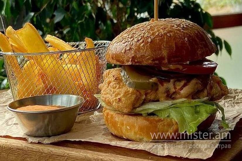 Бріош, салат Айсберг, куряче філе в паніровці, цибуля синя, огірок маринований, соус барбекю. Картопляні діпи та соус 1000 островів.
