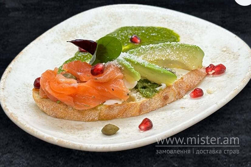 Чіабата, лосось слабосолений, авокадо, крем сир, салат бейбі мікс, сир Пармезан, каперси, соус Песто.