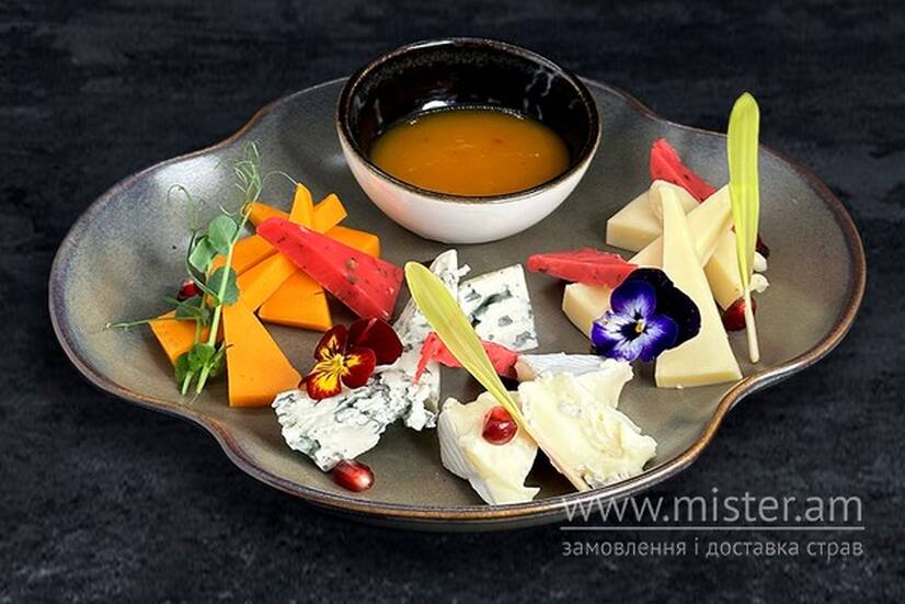 Сир базилік, сир з томатами, сир Камамбер, сир Дор Блю, сир Чеддер, джем абрикосовий.
