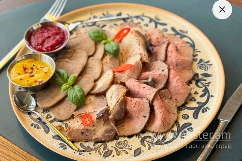 Вишукана м’ясна нарізка, що поєднує ніжну буженину, соковитий ростбіф і делікатний відварний язик. Страву доповнюють яскравий буряковий соус та пікантний гірчичний діп для гармонійного смакового акценту.