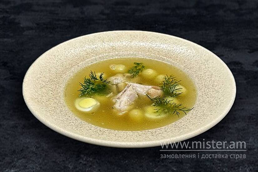Бульйон, яйце перепелине, філе стегна, картопляні кнелі, зелень.