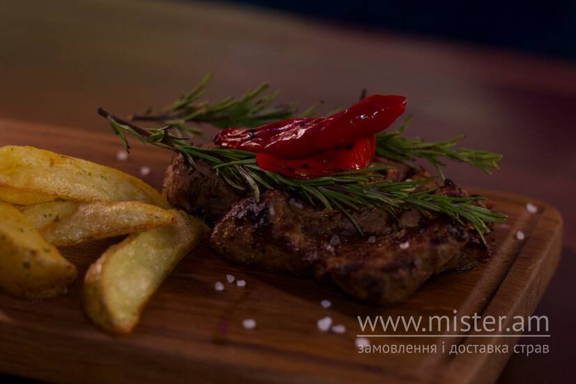 Соковитий стейк з ошийка, приготований на мангалі до ідеальної рум’яної скоринки, доповнений ароматною картоплею по-селянськи та пікантним перцем чилі для яскравого смакового акценту.