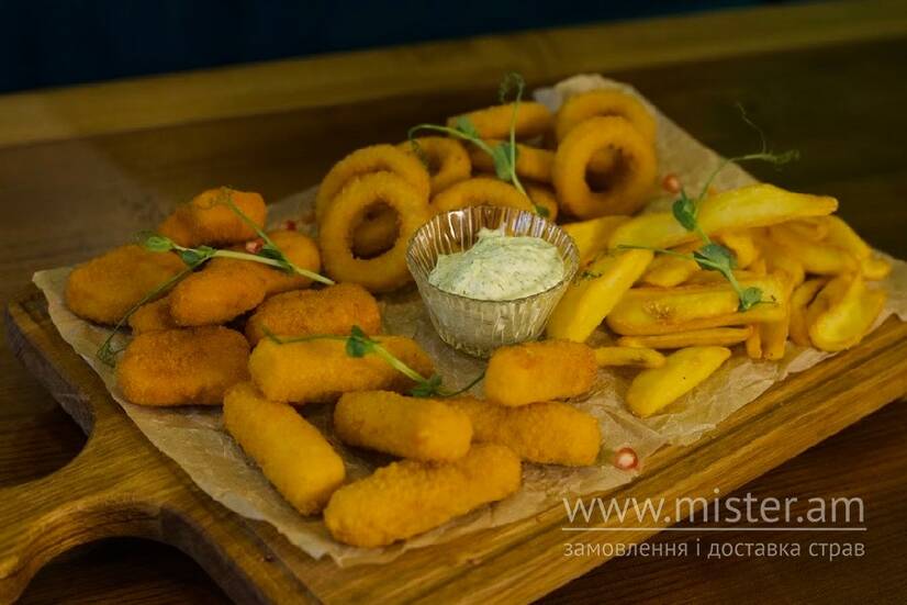 Хрумкі сирні палички, золотисті цибулеві кільця та ніжні нагетси подані з ароматними картопляними діпами та часниковим соусом. Ідеальна закуска для компанії до улюбленого пива.