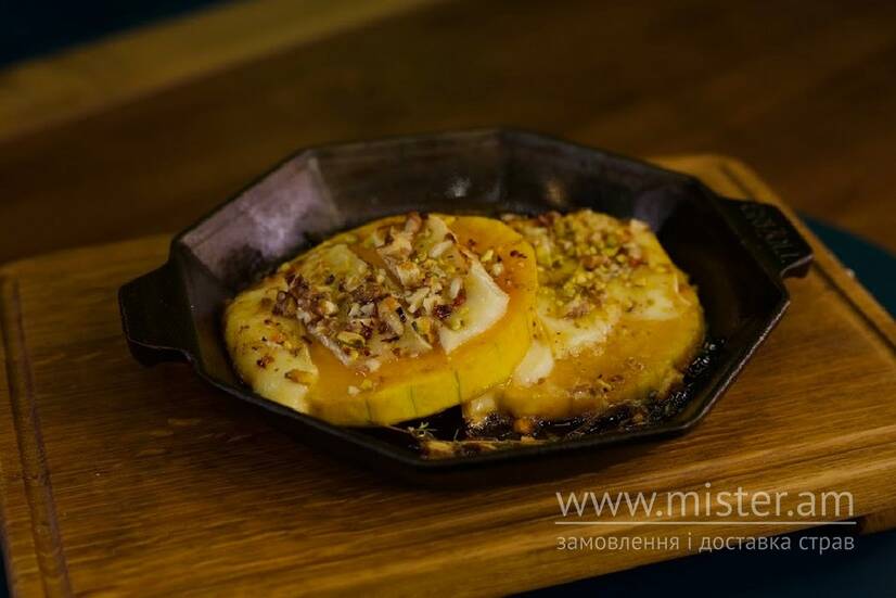 Тепло каміна: запечені гарбузові медальйони з тягучим камамбером, духмяними спеціями і хрусткими горіхами. Подаємо на розпеченій пательні з тімʼяном та вершковим маслом/