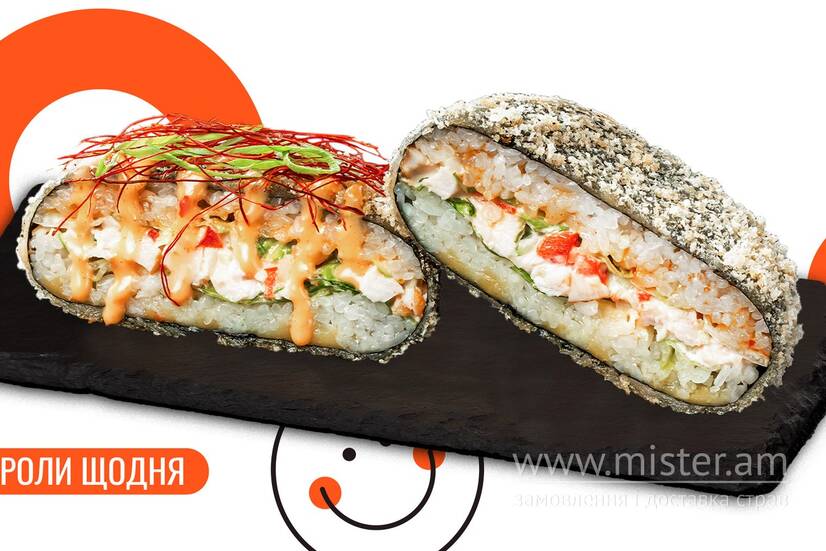 Рис, копчена курка, огірок, перець болгарський, салат айсберг, сир, борошно темпура, сухарі панко, соус світ чилі, майонез, чилі нитка, цибуля зелена.