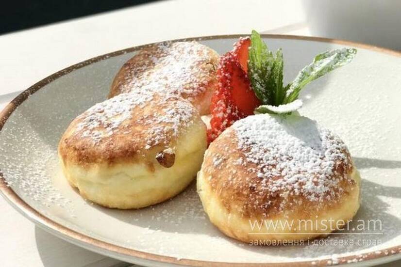 Ятрань Улюблені сирники без борошна, подаються з густим йогуртом і полуничним кюлі