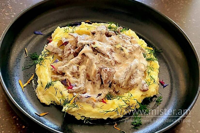 Ятрань Бефстроганов з яловичини, подається з картопляним пюре
