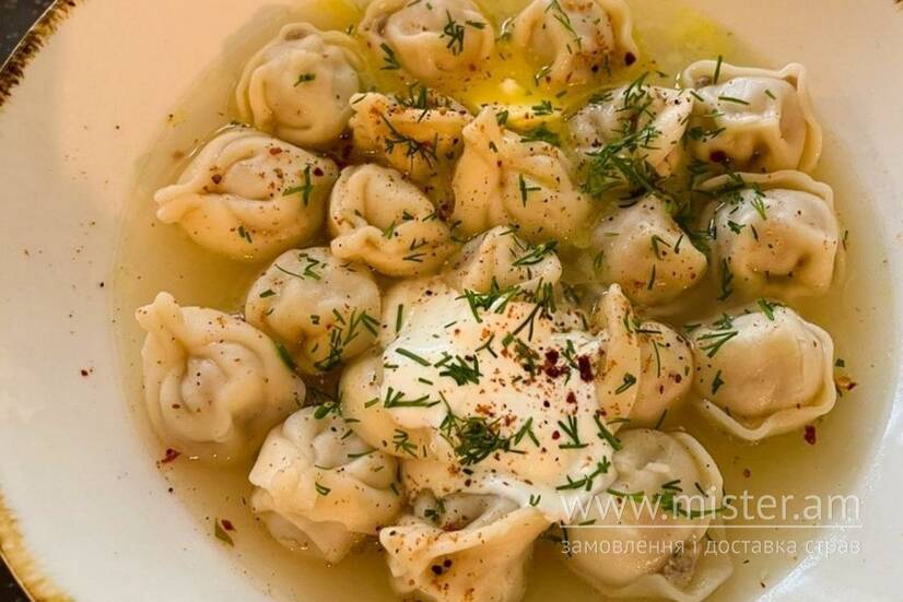 Пельмені з трьох видів м`яса на курячому бульйоні