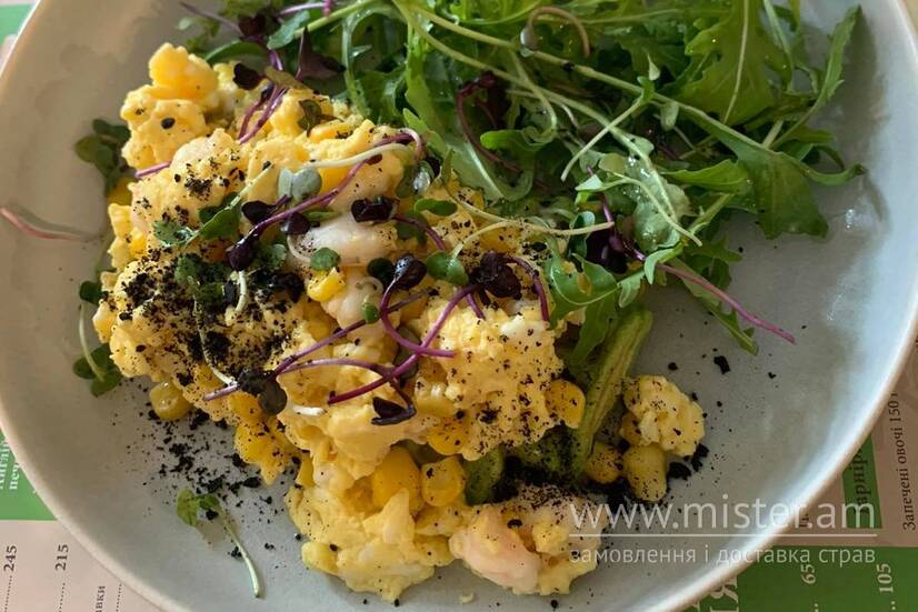 Вафля шпинатна та бовтанка з креветками і кукурудзою