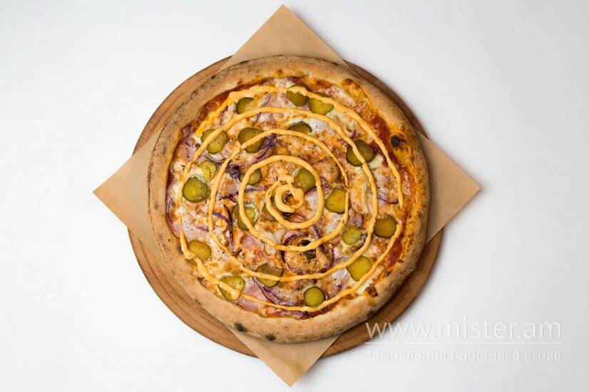 Томатний соус, сир моцарела, бочок, соковите курча, маринована червона цибуля, сир чедер, квашений огірок, соус бургер.