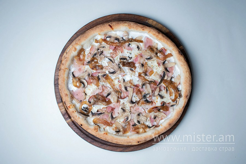 Вершковий соус, сир моцарела, бочок, печериці, цибуля карамелізована.