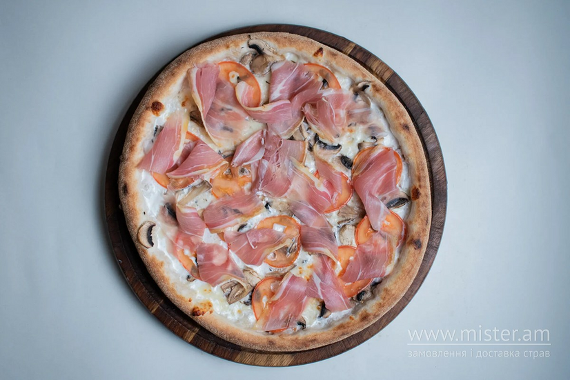 Вершковий соус, сир моцарела, печериці, томати, прошуто.