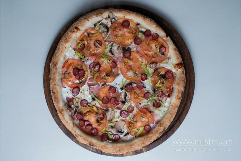 Вершковий соус, сир моцарела, бочок, мисливські ковбаски, печериці, помідор, цибуля порей, часникова олія.