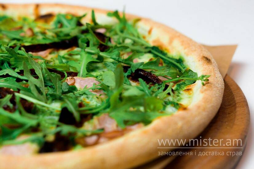 Вершковий соус, сир моцарела, шпинат, шинка, в`ялені томати, рукола, часникова олія, орегано.