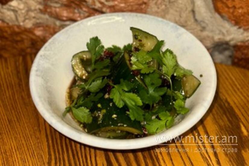 Соковиті огірки, злегка розбиті для кращого вбирання смаку, подаються з ароматною заправкою на основі темного рисового оцту, кунжутної олії та пікантного перцю чилі. Легка гострота та насичений смак роблять цю страву ідеальною закускою.