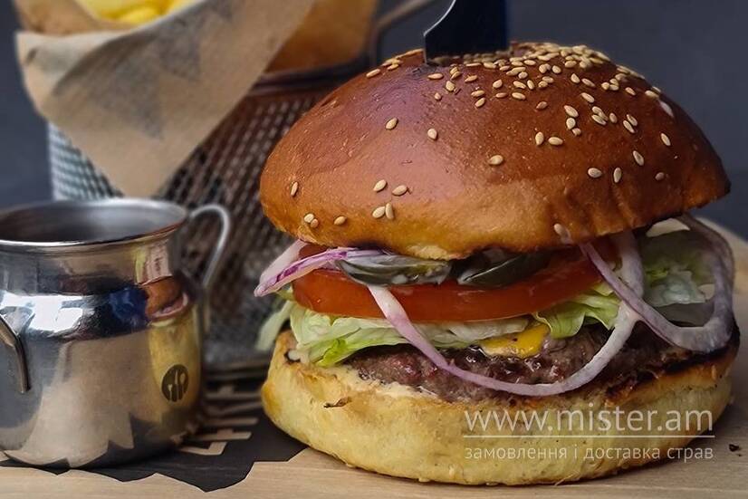 Смажимо в хоспері яловичу котлету, підігріваємо булочку бріош, додаємо твердий сир, соус до бургера, хрусткий солений огірок, листя салату, солодку синю цибулю та свіжі томати. Подаємо із картоплею фрі та кетчупом.