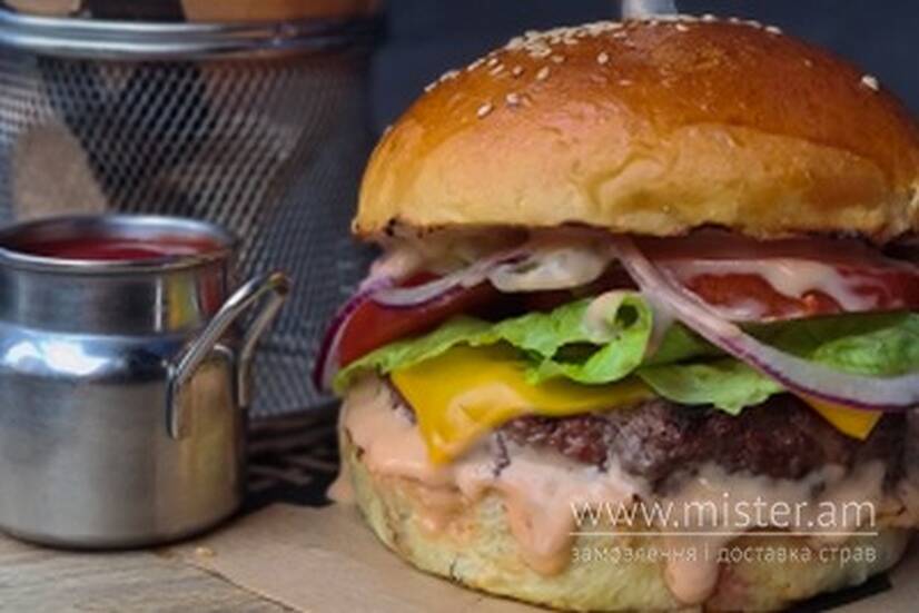 Смажимо в хоспері яловичу котлету з преміального американського м`яса, підігріваємо булочку бріош, додаємо твердий сир, соус до бургера, хрусткий солений огірок, листя салату, солодку синю цибулю та свіжі томати. Подаємо із картоплею фрі та кетчупом.