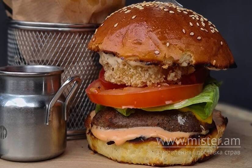 Смажимо в хоспері куряче стегно, підігріваємо булочку бріош, додаємо твердий сир, соус до бургера, листя салату, цибулеві кільця та свіжі томати. Подаємо із картоплею фрі та кетчупом.