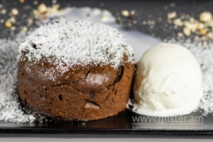 Подаємо теплим із рідким шоколадом в середині та кулькою морозива.