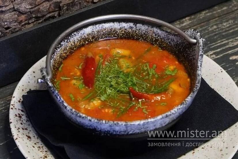 М`ясний наваристий пікантний суп. Готуємо на яловичині, свинині та копченому бочку. Додаємо картоплю, моркву, болгарський перець та перець чілі, томати, часник та багато спецій. При подачі посипаємо зеленню та зеленою цибулею.
