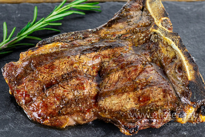 Стейк Нью Йорк на Т-подібній кості. Витриманий за технологією сухої ферментації, відповідно більш насичений в смаку. Кістка додає нотку шкорлупи грецького горіха в ароматі стейка. Готуємо в хоспері. Рекомендований ступінь просмажування medium; medium well.